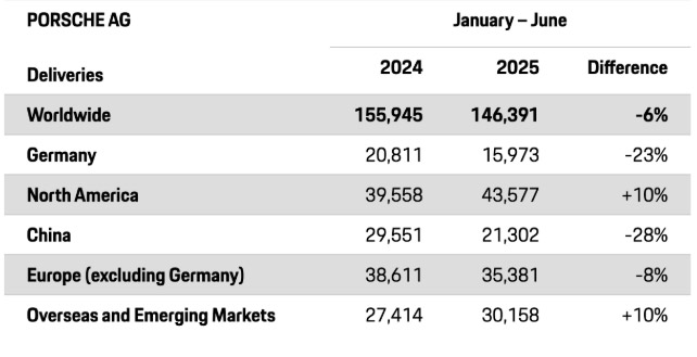 从2022年开始,保时捷在中国的销量已经连续三年下滑。2025年上半年,保时捷在全球共交付146391辆汽车,同比下降6%;在中国市场交付21302辆汽车,同比下降28%,降幅远超其他市场。